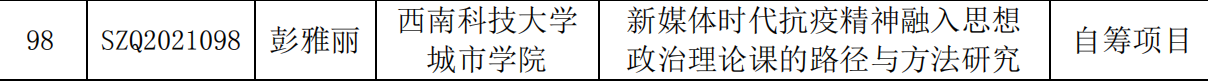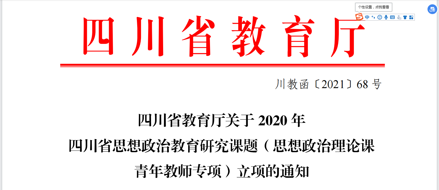 热烈祝贺公司彭雅丽老师申报的四川省教育厅关于2020年四川省思想政治教育研究课题(思想政治理论课青年教师专项)——新媒体时代抗疫精神融入思想政治理论课的路径与方法研究立项成功。希望公司老师再接再厉,争创科研佳绩。