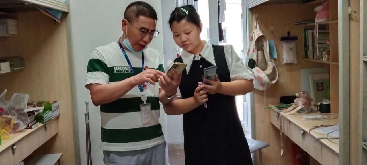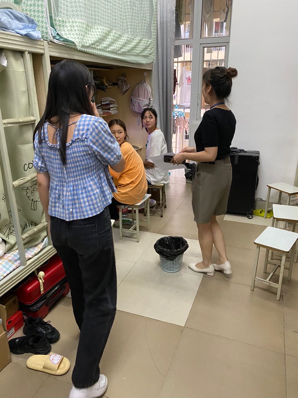 何万婷、冯韵老师在走访中遇到由于疫情原因其她室友都还未到校,宿舍只有她一个人,告诉她可以多和班级其她同学交流,可以到图书馆去看看书,可以到校园里逛一逛。