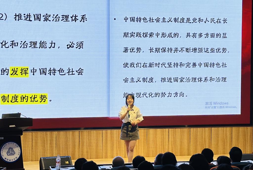 在现场展示环节,参赛选手聚焦《习近平新时代中国特色社会主义思想概论》课程教学内容,用准确的理论术语、精美的课件制作、灵活的展现形式,就教学内容娓娓道来,得到了评委老师的认可与肯定。