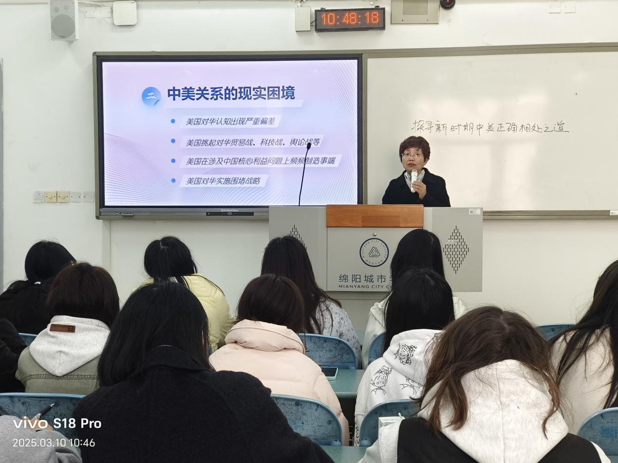 党委副书记刘续梅副教授重点讲述了解答中美关系的必答题,强调相互尊重、和平共处、合作共赢这三大原则是确保中美两艘巨轮不偏航、不失速、不相撞的重要航标,以丰富的案例,深入剖析当下的热点问题,带着员工把握时代脉搏,了解国家发展战略和世界格局的风云变化,生动形象且深刻地为我们带来了精彩的一课。