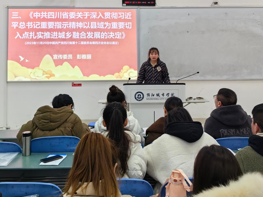为深入学习贯彻习近平总书记对四川工作系列重要指示精神,支部宣传委员彭雅丽副教授组织与会人员深度学习了《中共四川省委关于深入贯彻习近平总书记重要指示精神以县域为重要切入点扎实推进城乡融合发展的决定》,引导全体党员教师把思想和行动统一到全会精神上来,把智慧和力量凝聚到全会确定的各项目标任务上来,努力为四川特色城乡融合发展贡献教育力量。