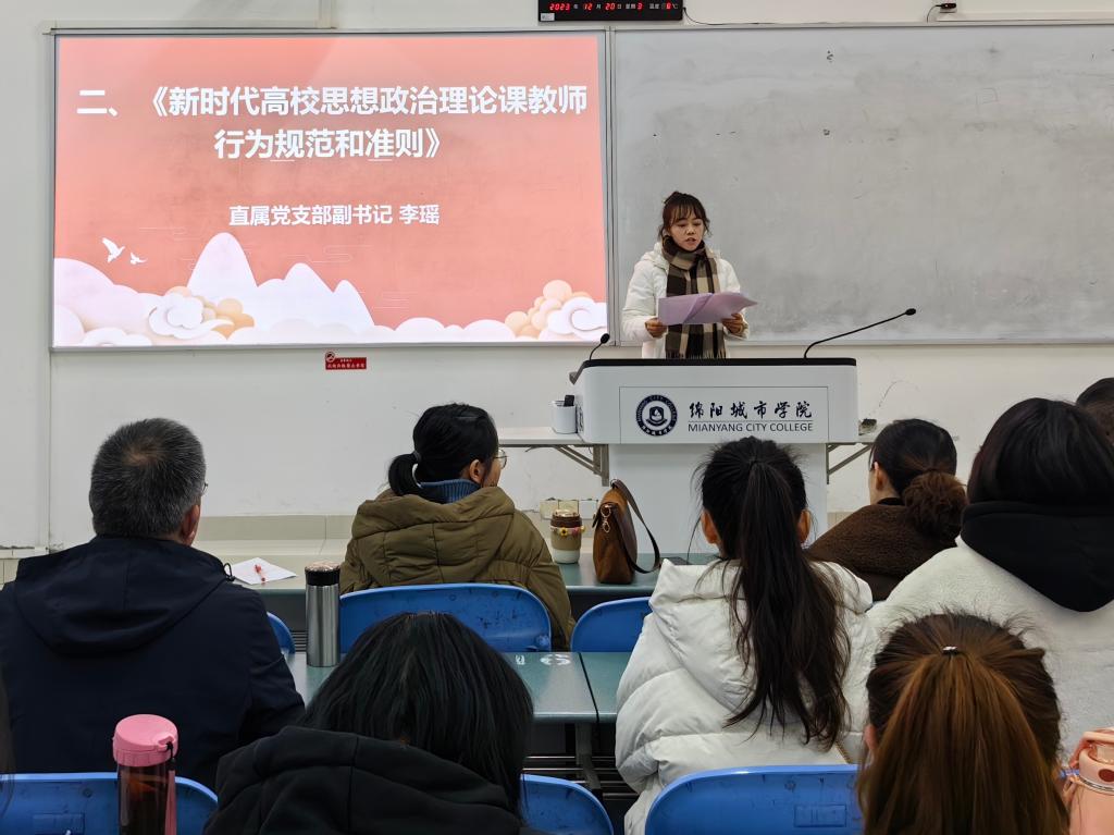 为全面贯彻落实党的二十大精神,深入学习习近平教育思想,大力弘扬教育家精神,高标准推动思政课教师师德师风建设,支部副书记李瑶副教授组织与会人员扎实学习了教育部印发的《新时代高校思想政治理论课教师行为规范和准则》,引导全体教师以更高标准规范职业行为,进一步增强责任感、使命感、荣誉感,践行教育家精神,努力成为“政治强、情怀深、思维新、视野广、自律严、人格正”的思政教师。