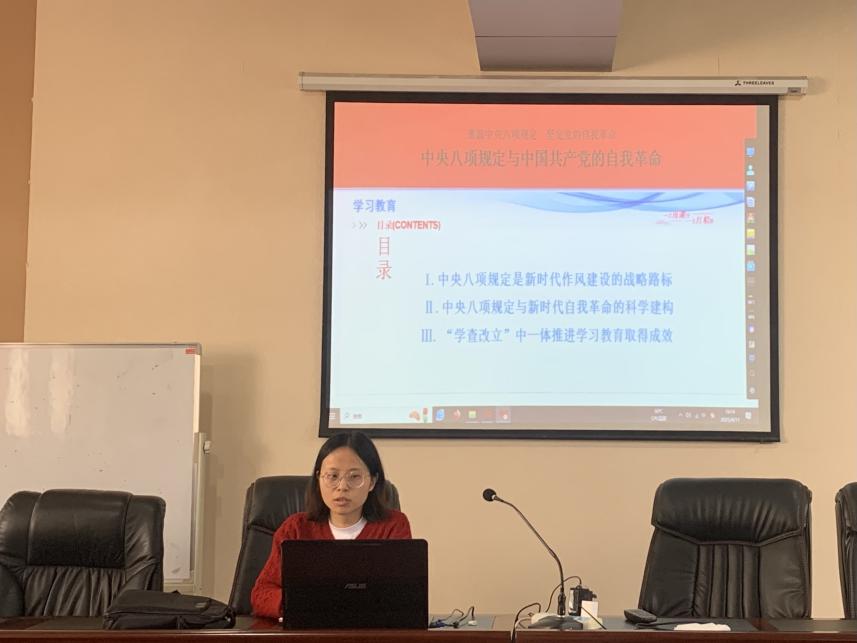 本次学习研讨坚持以习近平新时代中国特色社会主义思想为指导,党支部书记王婉同志首先从中央八项规定出台的背景、主要内容及重要意义等方面进行了详细讲解,为党员同志提供了清晰的学习思路。让同志们从“改进调查研究、精简会议活动、精简文件简报、规范出访活动、改进警卫工作、改进新闻报道、严格文稿发表、厉行勤俭节约”这八个方面对中央八项规定精神有了全方位的了解。